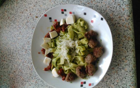 Těstoviny s rukolovým pestem a masovými kuličkami